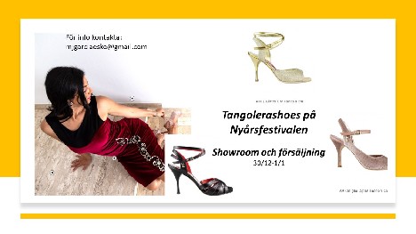 Maria Garcia kommer att sälja Tangoskor från italienska Tangolera (tidigare Bandolera). Tangoleras skor är kända för att vara särskilt bekväma. Se mer på deras hemsida: http://tangolerashoes.com/